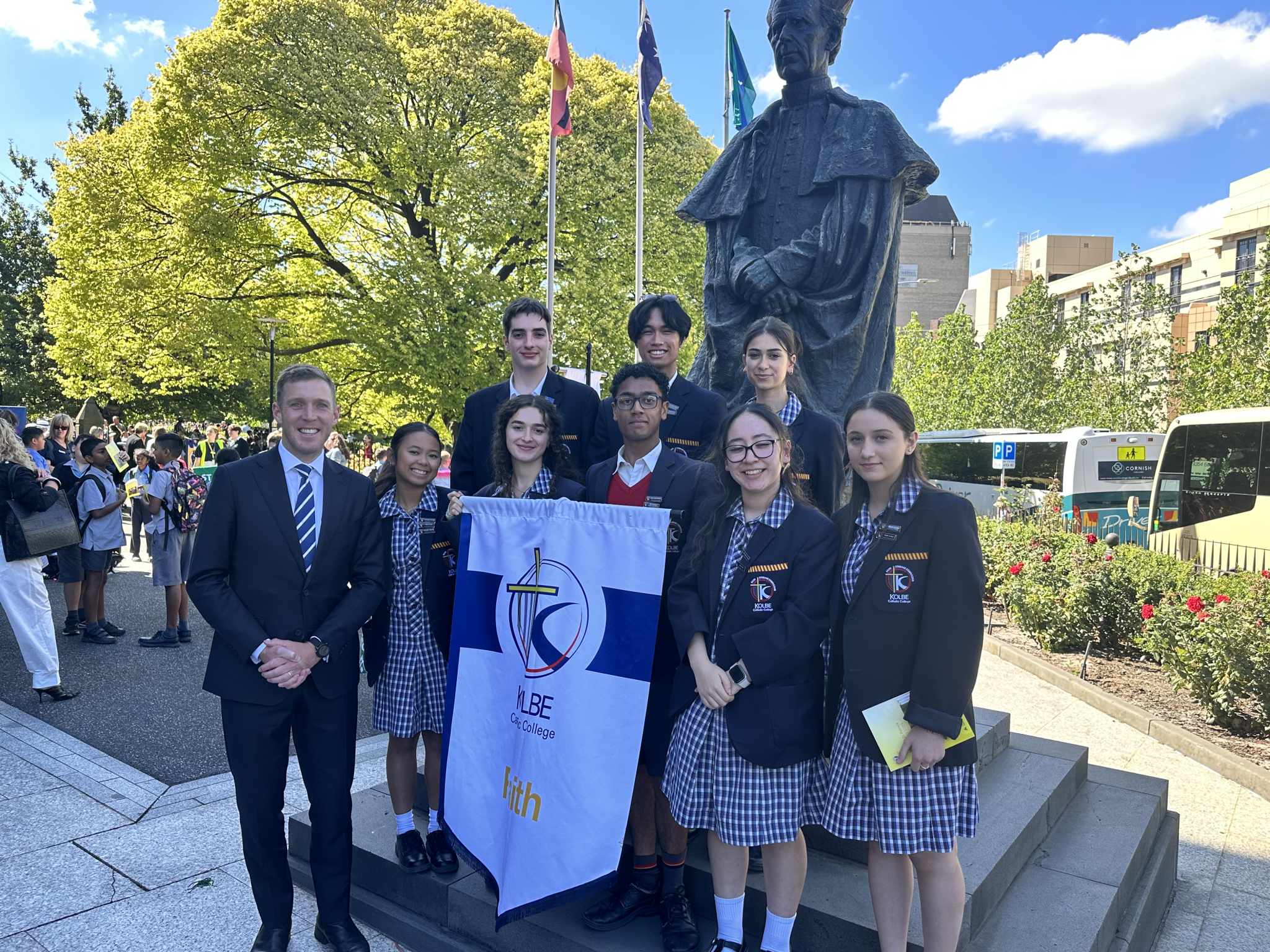 On Friday 15 March, to conclude Catholic Education Week, all the Catholic Schools in the Melbourne diocese gathered for mass at St. Patrick’s Cathedral. The Mass was presided over by Archbishop Peter A. Comensoli, celebrating the theme ‘In the Light of Christ’. Kolbe Catholic College was ably represented by members of our Student Leadership Team, taking time out of their busy academic schedules to attend this significant annual event. I also thank Iwan Walters MP for finding time to speak with our Kolbe students and taking photos with us at the Cathedral.